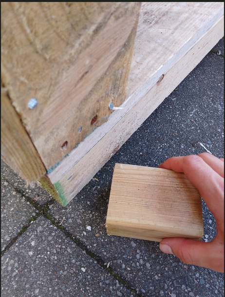 For this stage you will need a claw hammer and nails, you should wear impact resistant safety glasses, gloves and a dust mask. Use the hammer to tap the nails into the battens in the position indicated on the plans, net place the wood on the ground with the nails horizontal to the ground next place the shorter batten next to the batten with the nails, securing it with your feet gently tap in the nails with the hammer to secure the corner, repeat for the next three corners before securing the middle batten. Next nail the decking boards on to the top of the base frame.