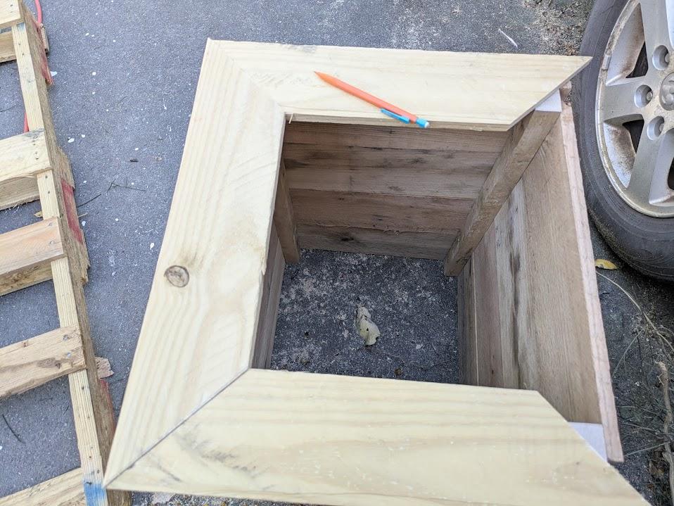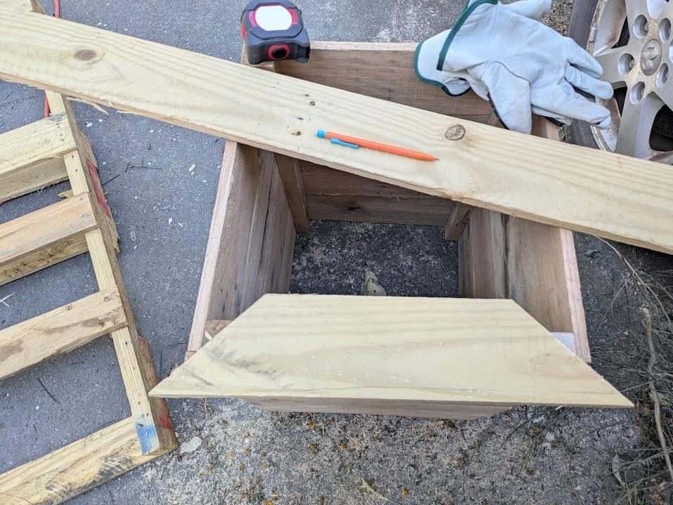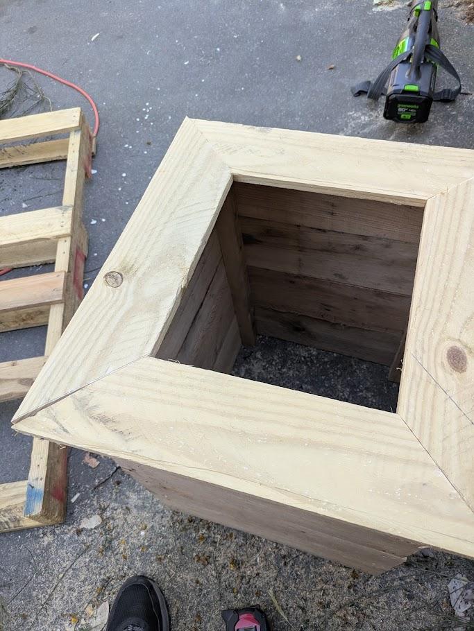 After I had all my measurements and the 2 pallets taken off, it was time to give it a miter cut. My dad likes to say, “Measure twice, and cut once,” because you can only cut once. I cut the board on a 45-degree angle, and after cutting it all, I put it on the top of the box, and it looked beautiful!!!