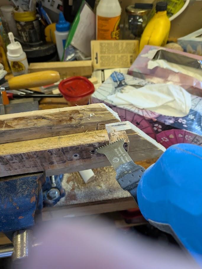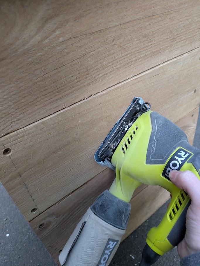 I was stuck with using the jigsaw because the table saw’s blade was dull. We did have a new blade for it, we just lost where the fancy tool to tighten it was. Thankfully, though, we found it, so I was able to finish the rest with the table saw.