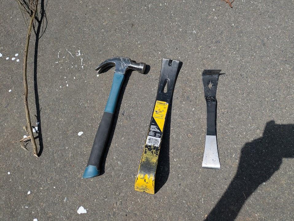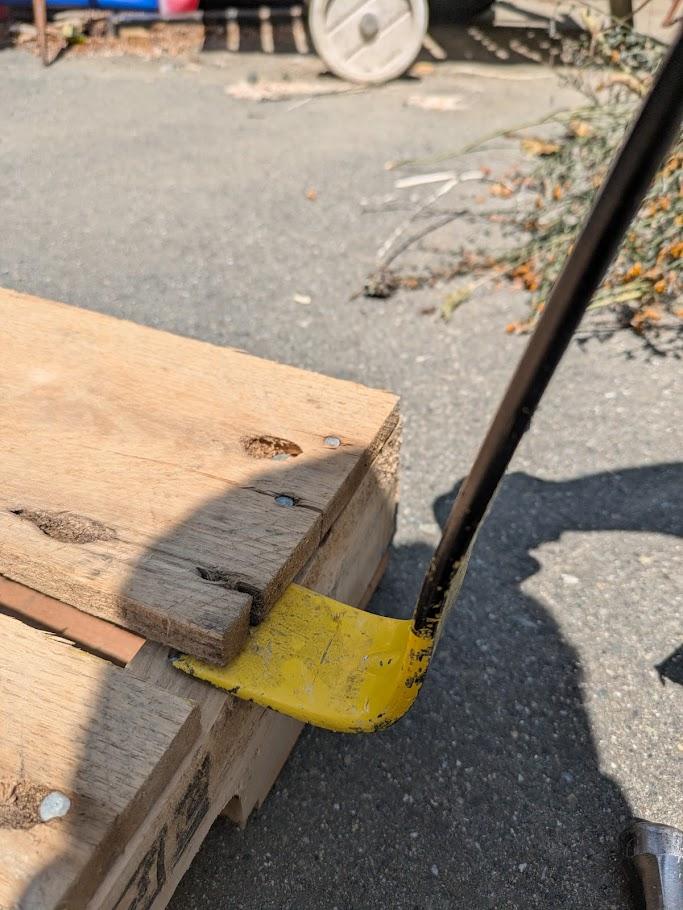 I first started by taking apart one of the pallets I had. I took my crowbar and hammer, hammering it underneath the wood and then pulling out the nail. You might need to add a little bit of leverage to the hammer if you’re struggling to pull out a nail, and the same with the board.