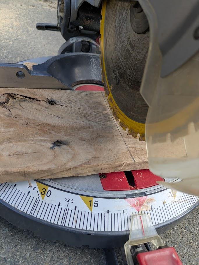 I took my chop saw to cut the boards to length. Some of the boards were a bit cracked and therefore bent. So I took some clear Gorilla glue and clamped it. And for some of the others this wasn’t much of a worry because once I screwed them in they should flatten.