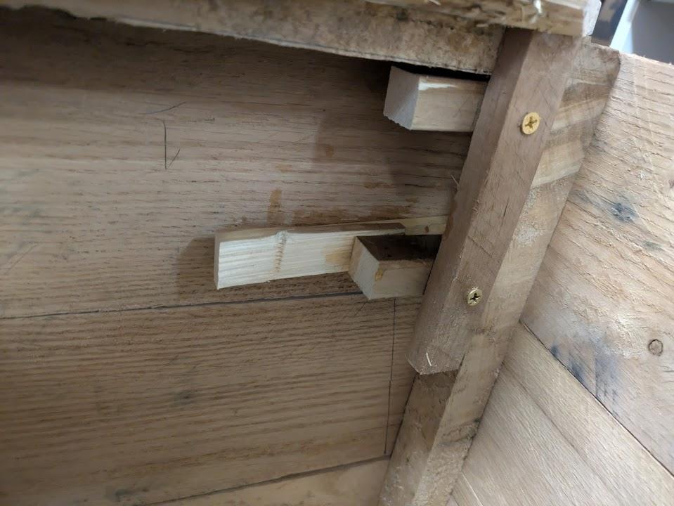 Because the screws weren’t long enough, I decided to glue it in place. I had the little support screwed to the pole so it would fit evenly, and I glued it to the box clamping it. Afterwards, I repaired the pole that broke in half with some wood glue.