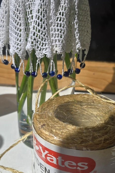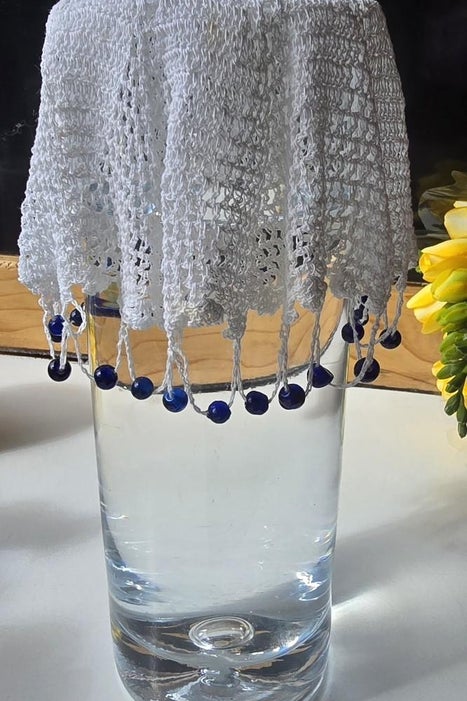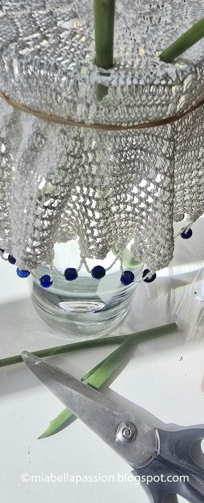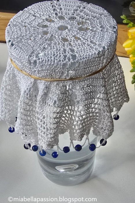 Note: To change the vase water, undo the bow, lift up the dolly and rubber band with the flowers, set aside, change water, and carefully place the flowers back in. Then push the rubber band back into position, tightening the doily, and tie the ribbon or twine bow back in place.